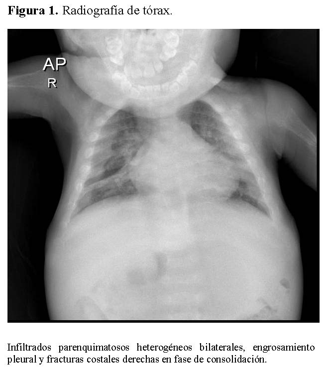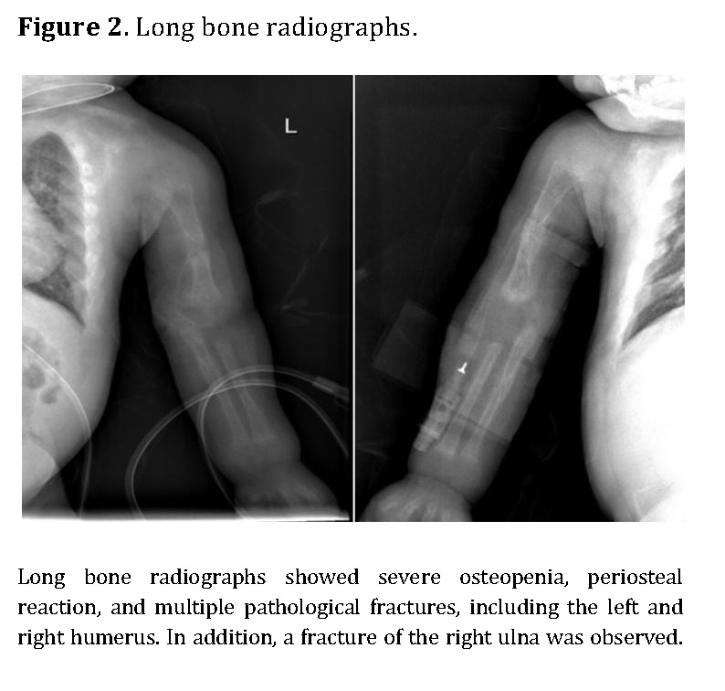 Chest radiography showed bilateral heterogeneous parenchymal infiltrates, pleural thickening, and right-sided rib fractures in the consolidation phase (Figure 1). Radiographs of long bones revealed severe osteopenia, periosteal reaction, and multiple pathological fractures, including the right and left humerus, right ulna, and right femur (Figures 2 and 3).