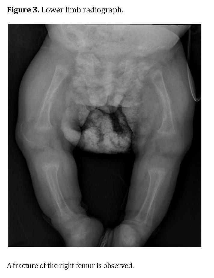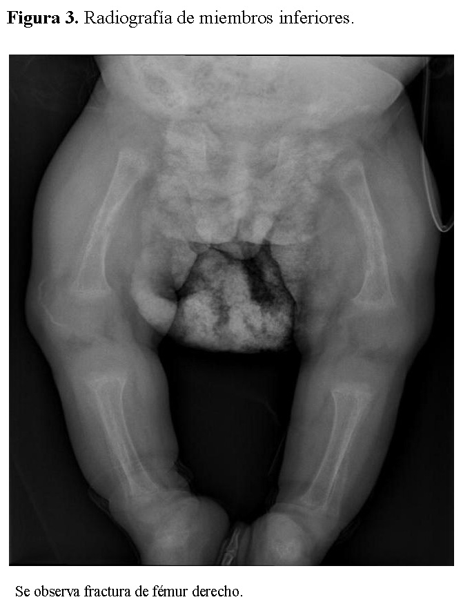 Replacement therapy with alfacalcidiol and calcium gluconate adjusted to weight and biochemical response was initiated, along with intensive nutritional support and conservative orthopedic management. The patient showed progressive improvement in clinical status and adequate oral tolerance, but with difficulty stabilizing biochemical parameters, requiring prolonged hospitalization.